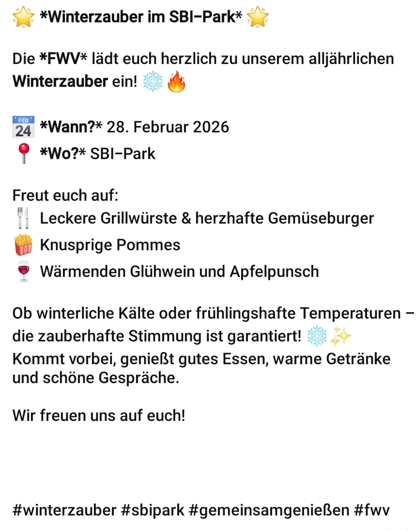 Am 15. Februar erwartet Sie im SBI-Park ein gemütliches Beisammensein mit leckeren Grillwürsten, herzhaften Gemüseburgern, knusprigen Pommes und wärmendem Glühwein.